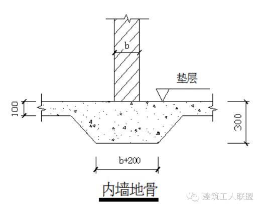 7、内墙地骨:按设计图纸要求,首层内隔墙下设地骨,即元宝基础,如下图所示: