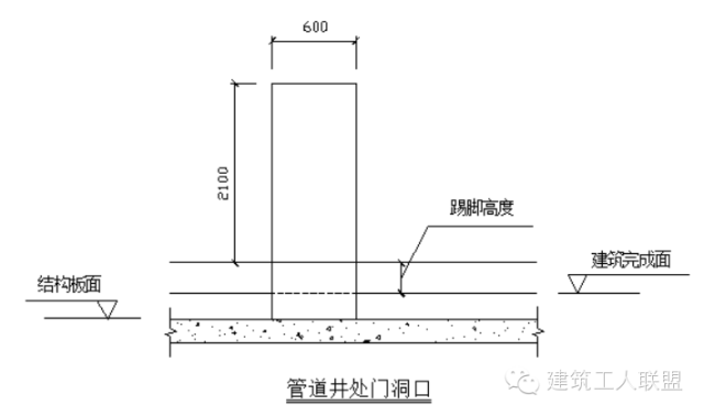 门窗洞口尺寸必须与图纸相符,以建筑标高为准,图纸中注明门洞口为M1521,则砌筑完墙体后门洞口尺寸为1500mm2100mm,门洞口高度应减去建筑地面做法之后还剩2100mm,见下图。特别注意管道井处门洞口尺寸,图纸中注明管道井门洞口为FM0621-丙,则砌筑完墙体后门洞口尺寸为600mm2100mm,门洞口高度除应减去建筑地面做法还应减去踢脚高度之后还剩2100mm,见下图:
