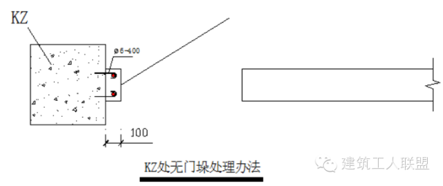 处理办法:调整门洞位置,做100mm宽门垛,纵向设212钢筋,与下部梁采用植筋方式锚固,上部锚固在过梁内,每隔400mm沿垂直方向设置一道水平拉筋,如下图。