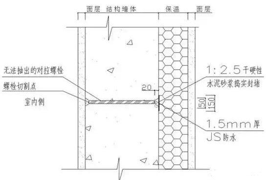 外墙(剪力墙)采用三段式止水螺杆,工艺流程:砼墙面扩孔割除螺杆浇水湿润水泥砂浆堵塞外侧JS防水施工饰面施工