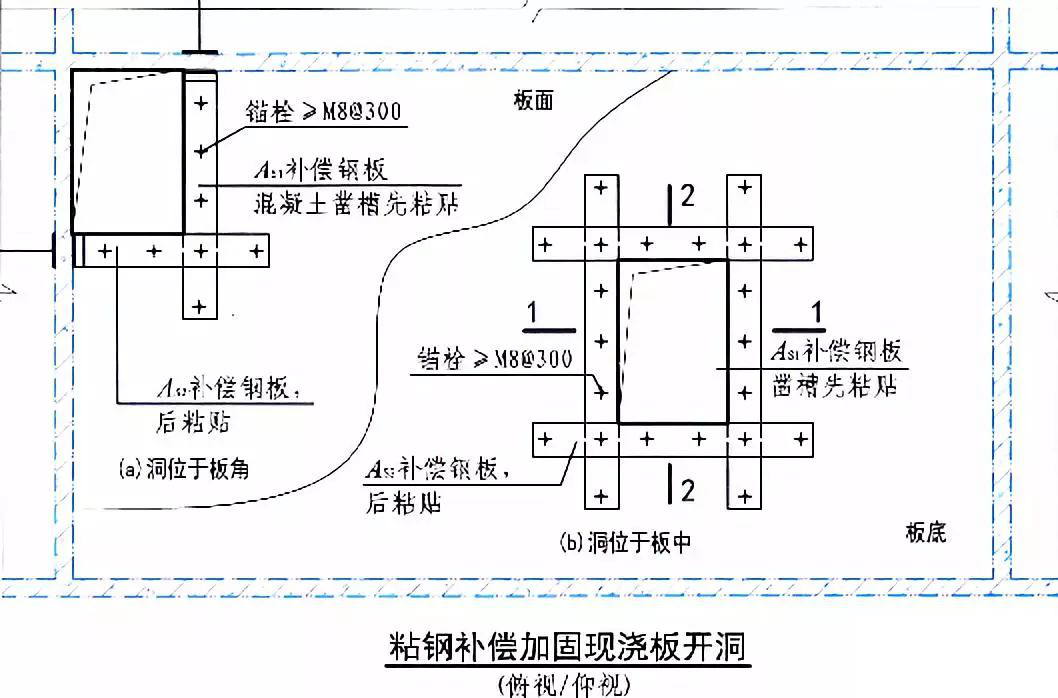 现浇连续板开洞,当开洞位置位于板的负弯矩区时,采用粘钢作为补偿加固时,应双面加固。对于粘贴钢板加固法,受力较大方向宜粘贴在最外层(其含义就是最后粘贴),受力较小方向钢板钢板粘贴于里层(最先进行粘贴)。此时,先粘钢板应于混凝土贴面处开槽,开槽厚度钢板厚度+3mm,以保证先粘钢板面与楼板地面齐平。亦可双向齐平粘贴,但需将受力较小方向钢板切成三段,现场焊接,局部后灌胶粘剂。