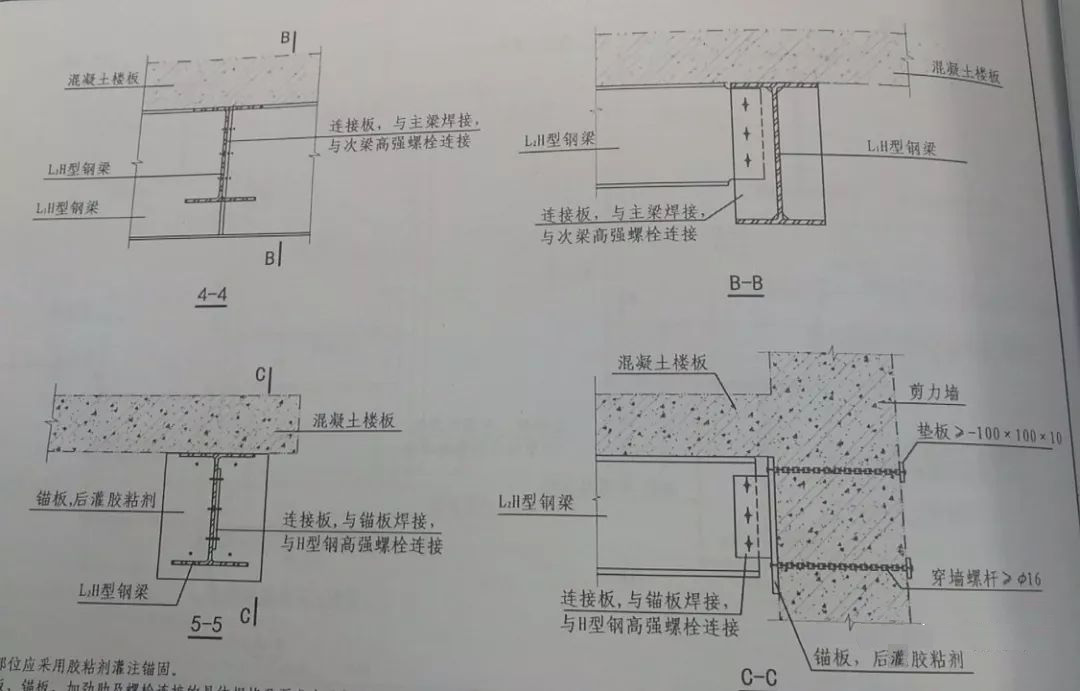 钢梁之间的连接,采用普通螺栓或高强度螺栓进行连接,C-C剖面所示为钢梁与混凝土梁(柱)的连接,采用化学螺栓或膨胀螺栓把连接板固定在混凝土梁(柱)上,连接板厚度不小于10mm,采用普通螺栓(或高强度螺栓)把钢梁与混凝土进行连接。