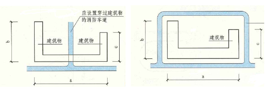 ②当建筑物沿街道部分的长度大于150m或总长度大于220时,应设置穿过建筑物的消防车道;确有困难时,应设置环形消防车道。