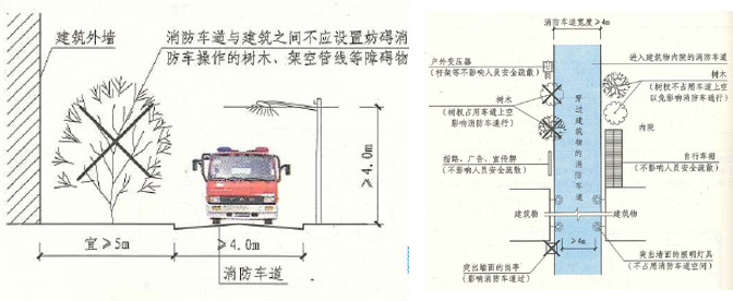 ◆消防车道与建筑之间不应设置妨碍消防车操作的树木、架空管线等障碍物;