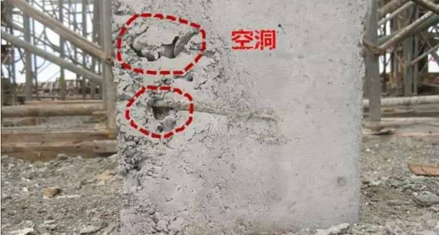 由于混凝土灌注时有一些部位堵塞不通,构件中就会产生空洞,空洞不同与蜂窝,蜂窝的特征是存在于未捣实的混凝土或缺水泥浆;而空洞却是局部或全部没有混凝土。空洞的尺度通常较大,以至于钢筋全部裸露,造成构件内贯通的断缺以至于结构发生整体性破坏。
