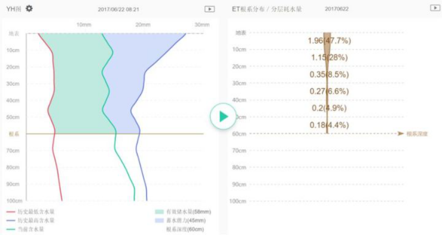 左图Y-H图中表示当前土壤含水量的绿色线越靠近红色线,表明作物正处于缺水胁迫,需要灌溉;如果绿色线长时间靠近蓝色线,则表明作物存在水涝的危险。根据Y-H图绿色区域有效储水量面积的变化,用户可以掌握作物的灌溉时间。
