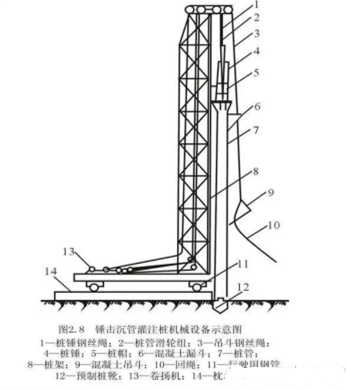 沉管灌注桩是利用锤击打桩设备或振动沉桩设备,将带有钢筋混凝土的桩尖(或钢板靴)或带有活瓣式桩靴的钢管沉入土中(钢管直径应与桩的设计尺寸一致),造成桩孔,然后放入钢筋骨架并浇筑混凝土,随之拔出套管,利用拔管时的振动将混凝土捣实,便形成所需要的灌注桩。