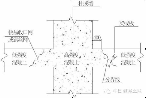 C、对于高柱采用两次浇筑,柱与梁原则分开浇筑,施工缝留在梁底下50mm,高柱采用串筒或导管浇筑混凝土的方法,分次浇筑时,每次浇筑混凝土均浇至顶层模板口以下200mm,拆除柱模时,保留顶层模板不拆。这样,可使施工缝处混凝土光滑平整,不流淌水泥砂 浆,避免施工缝部位的通病裙子现象。