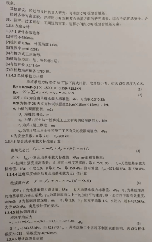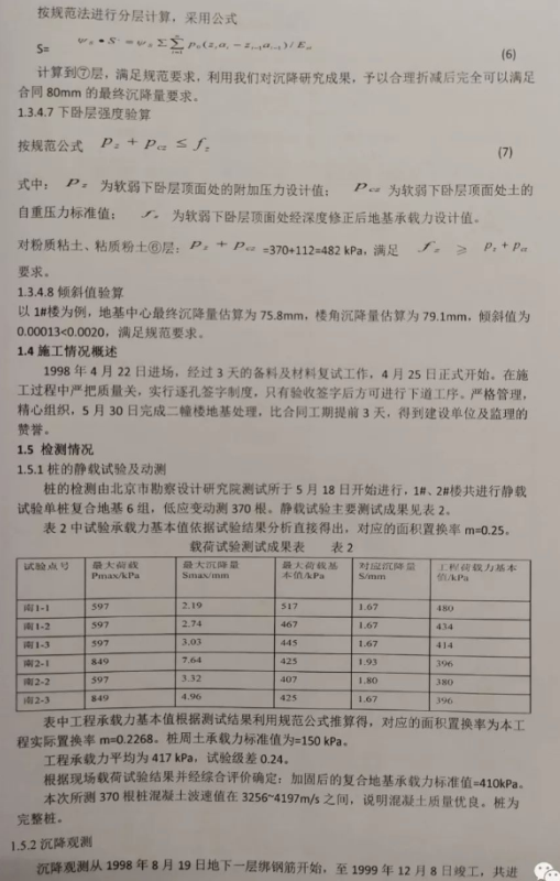 (1)设计指导思想:长桩为疏桩理论,即疏而长,很好地利用桩间土承受上部垂直荷载:短桩为密桩理论,即密而短,用较大的面积置换率,使桩承担较多的上部垂直荷载,桩土共同作用,达到上部荷载需要的承载力。短桩技术很好地利用了地基沉降的规律。
