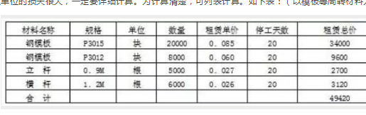 (2)停工期间周转材料的租赁费。施工单位有不少周转材料是向租赁单位租来的,停工期间的材料租赁费对施工单位的损失很大,一定要详细计算。为计算清楚,可列表计算。如下表:(以模板等周转材料为例)