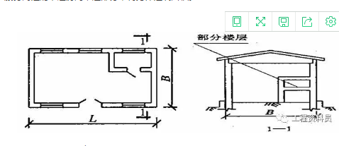 单层建筑物内如带有部分楼层者,亦应计算建筑面积。这部分主要指厂房、剧院、礼堂内的部分楼层。如图所示,只计算二层以上楼层面积,底层不再计算面积。如车间内为生产服务而建的单层房间,这部分不再另计建筑面积。