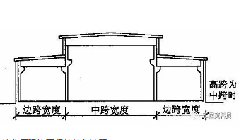 (1)当高跨为边跨时,其建筑面积是按勒脚以上两端山墙外表面的水平长度乘以勒脚以上外墙外表面至跨中柱外边线的水平宽度计算。