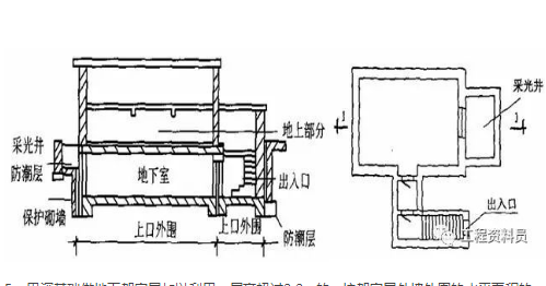 4.地下室、半地下室、地下车间、仓库、商店、指挥部等及附属建筑物有出入口的建筑物,建筑面积按其上口外墙(不包括采光井、防潮层及其保护墙)外围水平面积计算。人防通道端头出口部分为楼梯踏步时,按楼梯上口外墙外围水平面积计算。