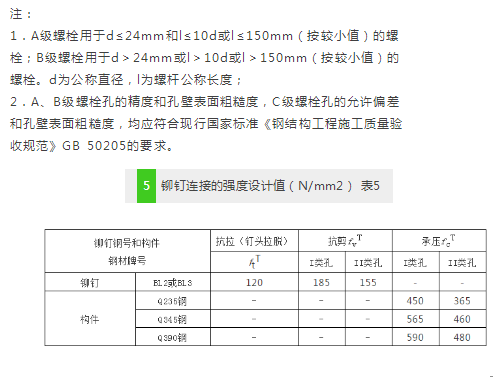 钢材的强度设计值(材料强度的标准值除以抗力分项系数),应根据钢材厚度或直径按表1采用。钢铸件的强度设计值应按表2采用。连接的强度设计值应按表3~5采用。