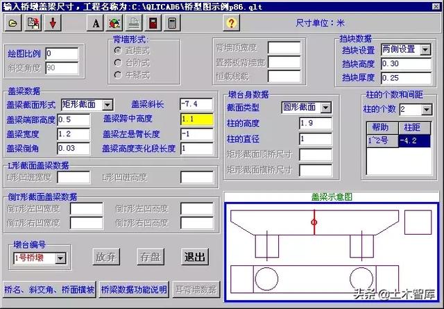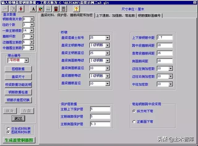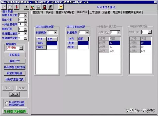 系统为用户提供了文件名为n2.qlt、n3.qlt的样板文件,桥墩编号为1号桥墩的数据是完整的,分别对应2柱式、3柱式盖梁结构,该数据文件既可计算又可绘图。