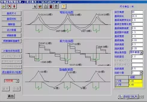 盖梁的尺寸优化取决于盖梁横断面尺寸、柱的个数、柱的间距、上部荷载等,一般情况下,保证盖梁正负弯矩接近的设计是合理的,如何实现?用户只要点击设计检查,弹出设计检查窗体,选左侧按钮盖梁尺寸、 盖梁材料、 上部横断面、 设计数据可进行数据修改,确定后存盘,点击计算生成盖梁包络图,图形区马上动态显示包络图,如果不符合设计者要求,再修改数据存盘后点击计算生成盖梁包络图,直到设计者满意。