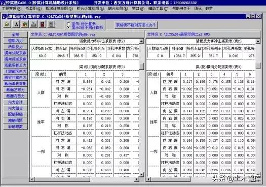 关闭设计检查数据,点击浏览盖梁计算结果按钮,选择工程文件名,这时,浏览结果窗体被显示在平幕中央,设计者可以快速浏览盖梁计算结果。如果设计者想浏览梁板横向分配系数,仅需点击横向分配系数按钮,如果想浏览盖梁内力组合结果,仅需点击内力组合 按钮。设计者还可以打开另一个工程的计算结果,先点击两份不同计算书,再打开另外一份已经计算好的计算书,两个不同计算结果可同时浏览、比较。用户也可点击打印按钮将盖梁计算结果打印出来存档、备查。