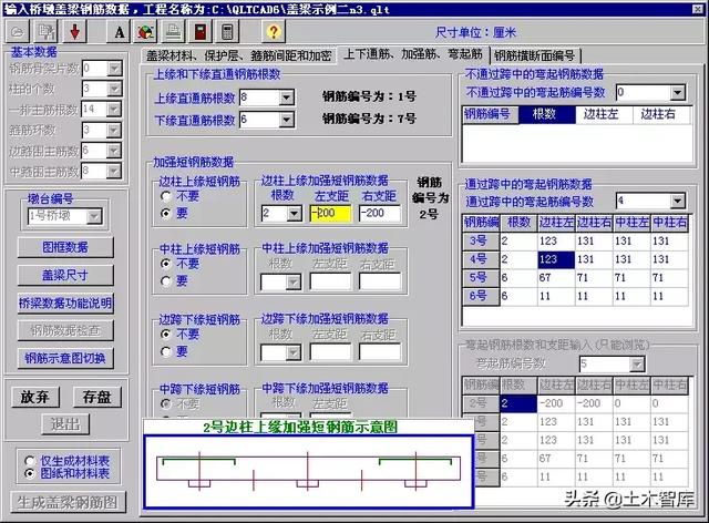2)输入或修改上下通筋、加强短钢筋、弯起钢筋数据
