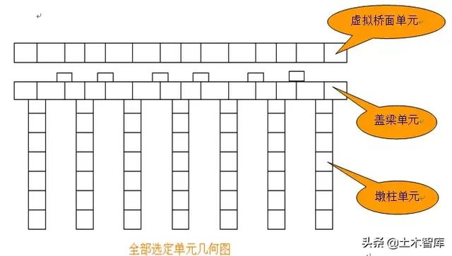 输入单元信息,建立墩柱、盖梁及垫石单元模型,对于T梁或小箱梁,因为支座间距比较大不能将车轮直接作用在盖梁上,我们还需要在盖梁上设置虚拟桥面单元来模拟车道面,与盖梁采用主从约束来连接,虚拟桥面连续梁的刚度至少大于盖梁的100倍。建立模型如下: