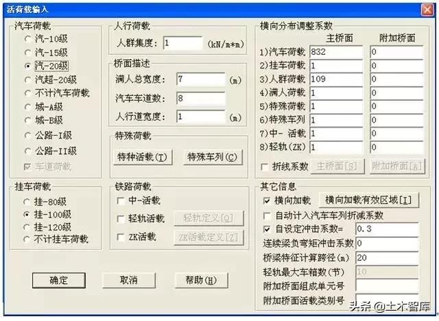 打开活荷载输入对话框,将单列车的最大反力输入横向分布系数中(此时的横向分布系数,已经不是真正意义的横向分布系数,它的大小就是一列汽车(或一辆挂车)对这个横向结构的作用力的大小,详细介绍可查看桥梁博士使用手册第80页)。