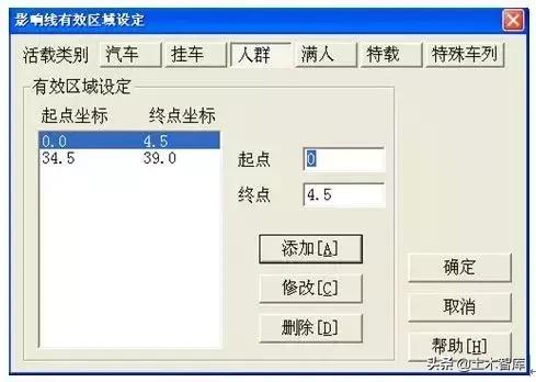 在活载输入对话框中人群集度和人行道宽度填入1,因为在人群荷载反力及横向加载区域已考虑了人群集度和宽度。