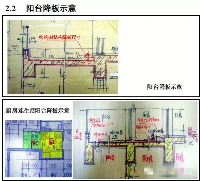 原来:生活阳台与厨房均结构对结构降100,然后厨房再回填20