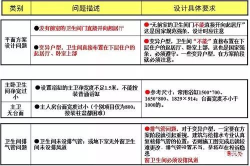 第一大类:设计问题户型方案对于厨房、卫生间平面设计的一些基本要求不甚明确或理解不够,使平面设计不合理,导致后期设计变更(有的项目,由于厨房或卫生间的调整,导致整个户型均需调整;调整量较大)。