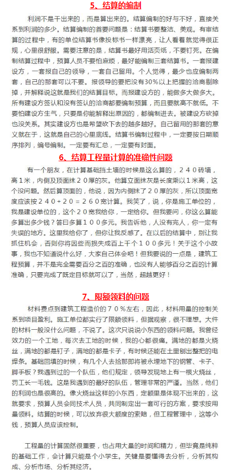很多预算人员最头疼的事莫过于对材料性.能、价格、工艺、品牌等的不了解了。特别是建设方的造价控制人员,更需要掌握更多的材料方面的知识。偶的经验是:预算人员,特别是建设方的预算人员,积累这方面的知识太容易了。当一个项目开始以后,会有很多的厂商自己找上门来,并且,他们都是有问必答的,你可以从他们那里学到非常多的知识。或许你会说,厂商来的都是推销人员,他们的专业知识并没有多少。不管他们有多少,对于造价控制人员来说,已经足够了。偶就是在这期间,把所有的厂商资料编制成册,需要的时候就查一下,或者打电话咨询,他们会非常高兴的为你解答。这里有一个最大的好处就是:他们会把竞争对手的产品批的一无是处,而你就可以利用这些免费的信息来打压单价了。