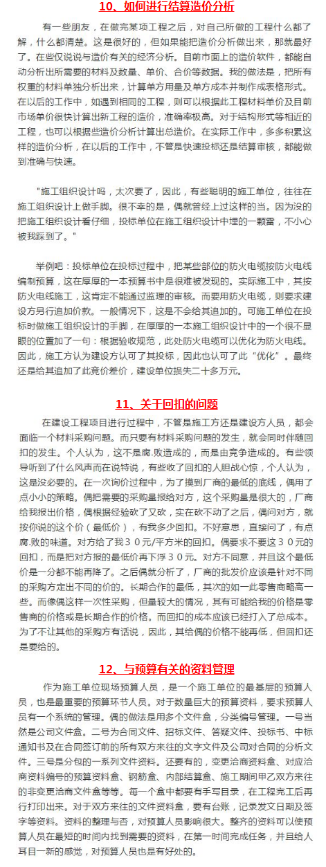 其实,个人觉得,处理好工作关系更重要。作为一个与直接领导关系非常好的预算人员,好处多多啊!其实,处理好这层关系很简单,所需要做的工作也并不多。本来,在施工单位现场的预算人员的工作就不是很多,一个月也就忙那么几天,过了那几天,时间还不都是属于自己的。因此,领导安排的工作应该积极主动的去做,去按领导的意思来做,遇到有些想不明白的问题,直接问你的领导该如何做,这样可以达到事半功倍的效果。在没事的时候,留心项目部的动向,提前把有可能要发生的事情做好(预算人员的工作),当领导需要的时候直接拿出来,比如说,结构快出正负零的时候,你就应该把正负零以下的成本算出来,不准确没关系,但一定要与材料人员进行沟通,进场多少材料,特别是周转材料一定要心中有数。如果你能在领导没有安排之前向领导提出:成本是多少,能够结算的金额是多少,有可能会亏损啊。个人觉得,最好是不要弄赢利了,前边一直报喜,到最后突然结算亏损了,那吃不了兜着走的一定是你。前边一直都报不好的结果,领导不会怪你的,因为工程不是你做的,材料也不是你进的,民工队也不是你选的,领导自然会分析原因想办法的,最后笑到最后的是你。