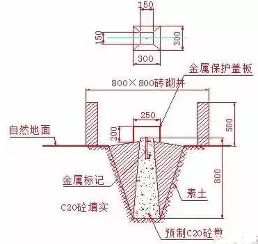 (2)现场建立控制坐标网和水准参照点。水准参照点需由永久水准点引入,永久水准点设置在距建筑物附处稳定、可靠的土层内,水准点应采取保护措施,确保水准点不被破坏。