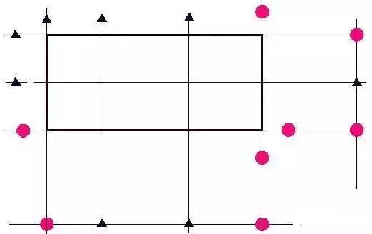 红色点作为一级控制点,永久使用。黑三角为临时用点,用于基础工程轴线的投测以及作为外控法轴线传递的控制桩。