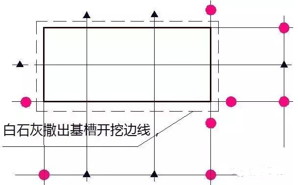 布置的主控制线撒出开挖线,这个工作要注意放坡尺寸和预留建筑物外墙的操作架距离。基槽开挖,在开挖线的位置是否留有工作面,还要考虑放坡。