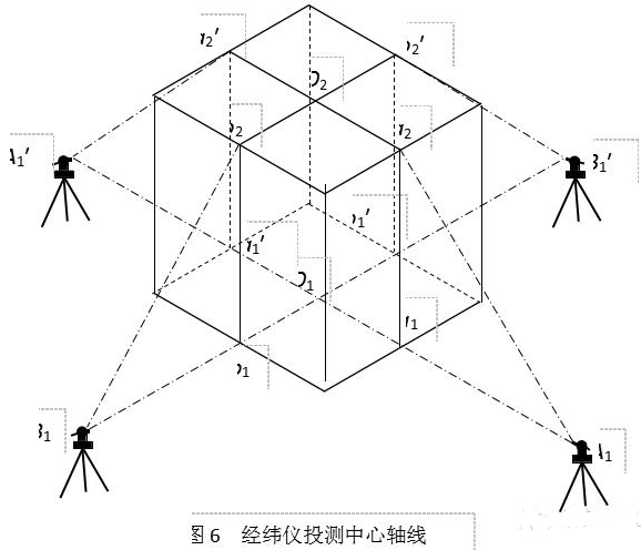 随着楼层不断升高,要逐层将轴线向上传递,如图6所示,将经纬仪安置在中心轴线控制桩A1、A1、B1和B1上,严格整平仪器,用望远镜瞄准建筑物底部已标出的轴线a1、a1、b1和b1点,用盘左和盘右分别向上投测到每层楼板上,如图6中的a2、a2等