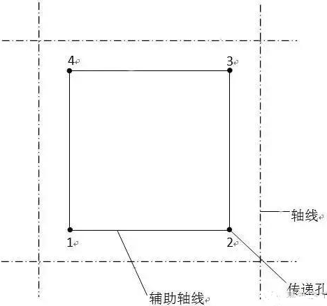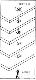 如图10所示,在预留孔上面安置十字架,挂上锤球,对准首层预埋标志。当锤球线静止时,固定十字架,并在预留孔四周作出标记,作为以后恢复轴线及放样的依据。此时,十字架中心即为轴线控制点在该楼面上的投测点。