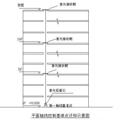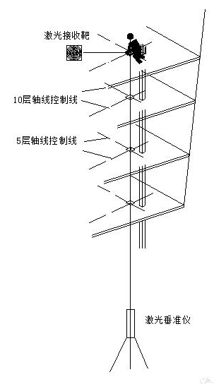 (1)将激光经纬仪架设在首层楼面基准点,调平后,接通电源射出激光束。