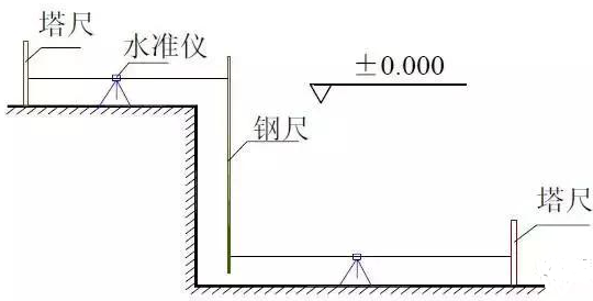 结构施工时,在首层施工完后,将高程控制点引至外壁无遮挡的柱身上,或在楼梯间,随着结构上升,用50m钢卷尺将高程向上传递。当传递高度超过钢尺整尺长时,应另设一道标高起始线。楼层内用水准仪将标高转至各相关构件上。