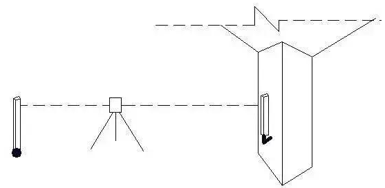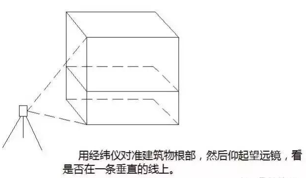 建筑物垂直度控制主要依靠建筑物角柱或外墙模板,要求合模期间进行复查,主要用吊线坠的方法。拆模后用经纬仪检测,如下图