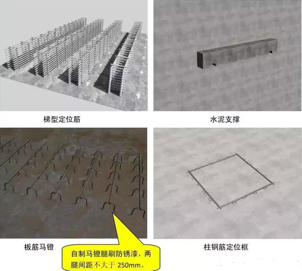 3、墙体钢筋网片绑扎完毕后,即可加设水泥撑和保护层垫块,水泥撑与墙体钢筋用绑丝绑牢,间距不宜超过 80cm,梅花形布置(或设水平梯子筋,间距不大于 2 米且每段墙不少于 2 个);保护层垫块均匀固定在钢筋网片上,间距不超过100cm。