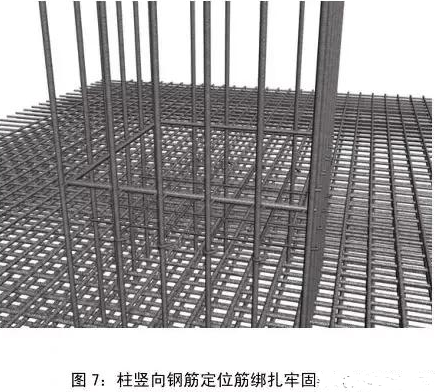 4、框架柱钢筋绑扎关键在于控制纵向主筋垂直和相对位置,在高出楼板顶面 5cm 处和 50cm 处分别加设一道钢筋定位框,在箍筋绑扎前利用定距框来限制立筋位置,定距框与脚手架间临时进行固定,保证定距框水平及与柱边线对应。