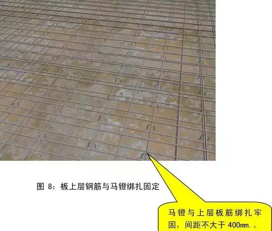 5、现浇板底层钢筋铺设完放置马镫,其间距不大于 500mm,与上层板筋绑扎牢固。