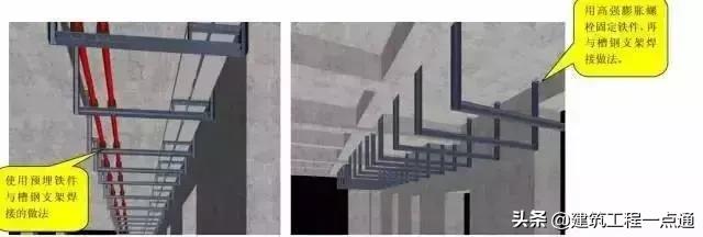 1)铁件预埋式支吊架:跟随结构施工,将铁件按照策划排布图的坐标、标高、间距定位预埋;在预埋完成的铁件上确定支吊架的水平面标高,将制作的支吊架焊接在预埋的铁件上。