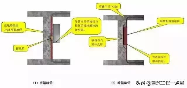 3、紧定式薄壁钢导管接地线进箱盒处采用配套的爪型锁母,管连接处拧断紧定螺钉做法。