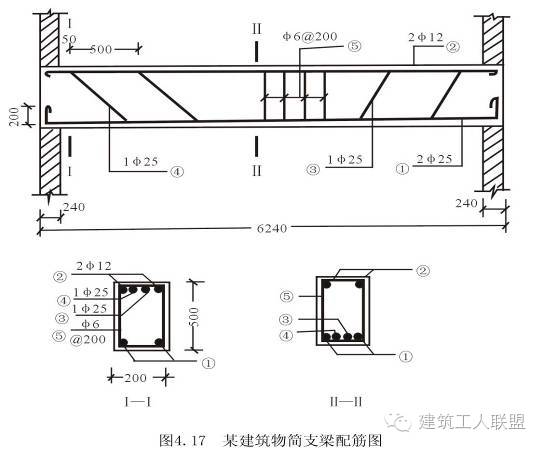 【例4.2】某建筑物简支梁配筋如图所示,试计算钢筋下料长度。钢筋保护层厚度取25mm。(梁编号为L1共10根)
