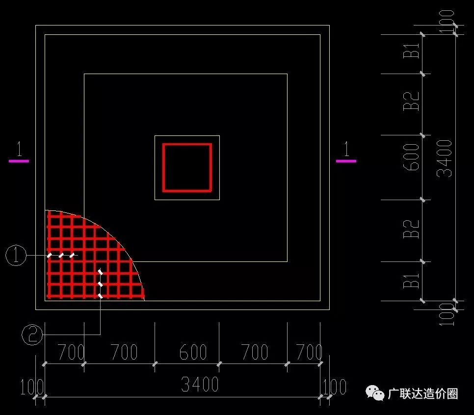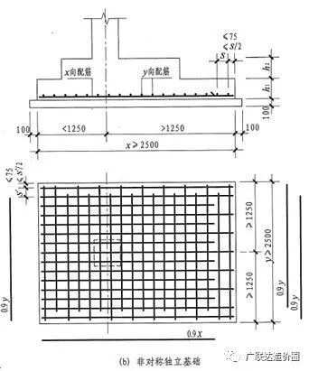 2)独立基础各边长度2.5m时,且柱子不在独基中间[柱中心距独基边距离:一边1.25m,一边1.25m],底筋构造: 16G101-3 P70