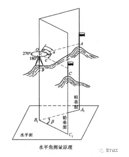 水平角是指过空间两条相交方向线所作的铅垂面间所夹的二面角,角值为 0~360。空间两直线OA和OB相交于点O,将点A,O,B沿铅垂方向投影到水平面上,得相应的投影点A,O,B,水平线OA和OB的夹角就是过两方向线所作的铅垂面间的夹角,即水平角。