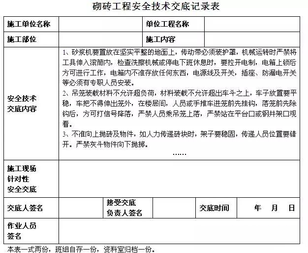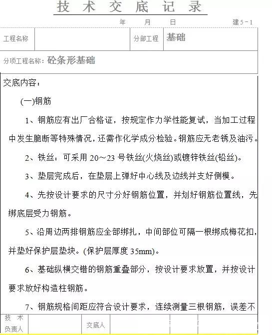 (5)技术交底要字迹工整,交底人、接交人要签字,交底日期、工程名称等内容要写清楚。技术交底要一式三份,交底人接交人存档备一份。