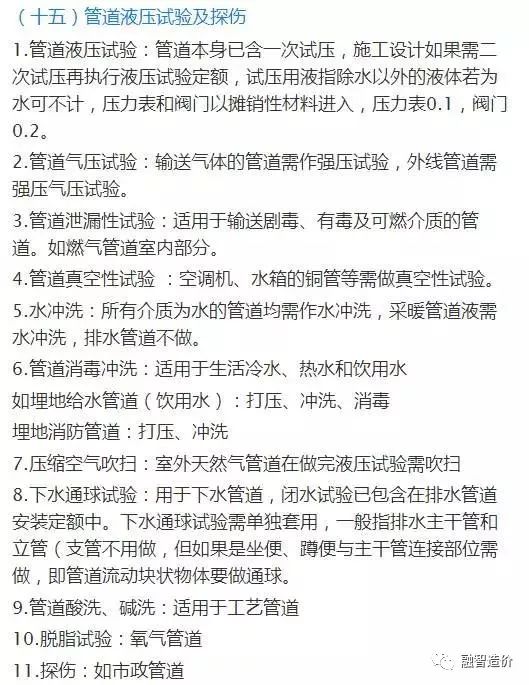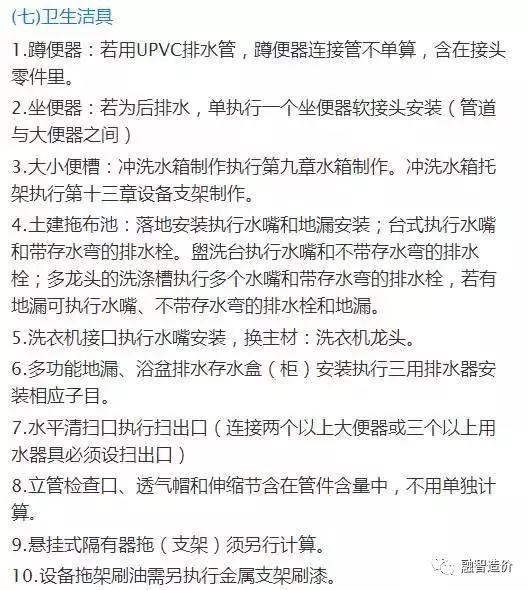 11.采暖、给水、热水系统立管管卡的设置:(1)楼层高度5m,每层必须装1个(2)楼层高度5m,每层不得少于2个(3)管卡安装高度距地1.5-1.8m,2个管卡匀称(4)多层建筑给水、排水管径大于25mm时立管可以不加支架,但排水立管最底层应加管墩。(5)排水铸铁、给水镀锌钢管立管应把支架做成落地卡。