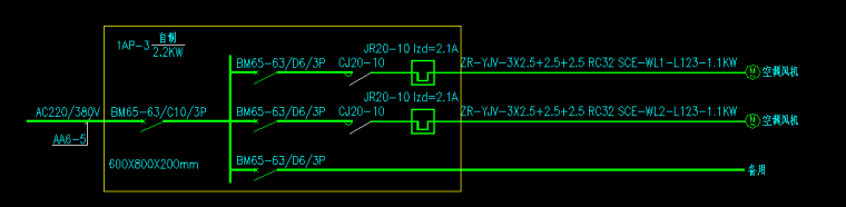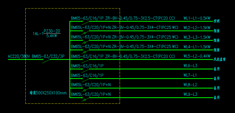系统图主要是由电源电压、总开关、分路开关、导线规格、穿管规格、敷设方式、回路编号、回路容量组成。