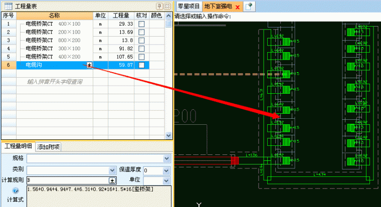 答:我们可以借用桥架构件能自动分出桥架内和桥架外的工程量进行处理,在电缆沟中不配管我们也可以将电缆沟考虑为桥架,以达到软件将该段工程量不配管,将电缆沟用桥架构件进行绘制,同样配电柜至电缆沟的竖向高度也可以使用桥架立管进行设置,从而达到一个回路从配电柜电缆沟进入桥架出桥架配电箱拉通计算,并且能正确计算出相应的配管、电缆工程量。如下图,绿色为电缆沟,红色为桥架,电缆沟与桥架在工程量表中分别列项: