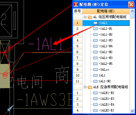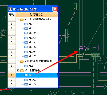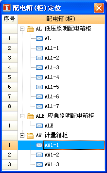 选择该命令后弹出配电箱(柜)定位窗口,在该窗口中软件将本张图纸上的配电箱命令以列表的形式显示出来,如图: